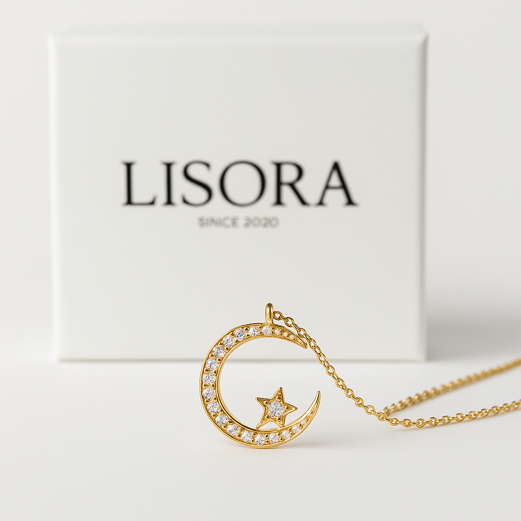 The shimmering star and moon pendants dangle gracefully from a beautiful collarbone chain, creating a look that is both elegant and unique . Perfect for women who appreciate subtle luxury.